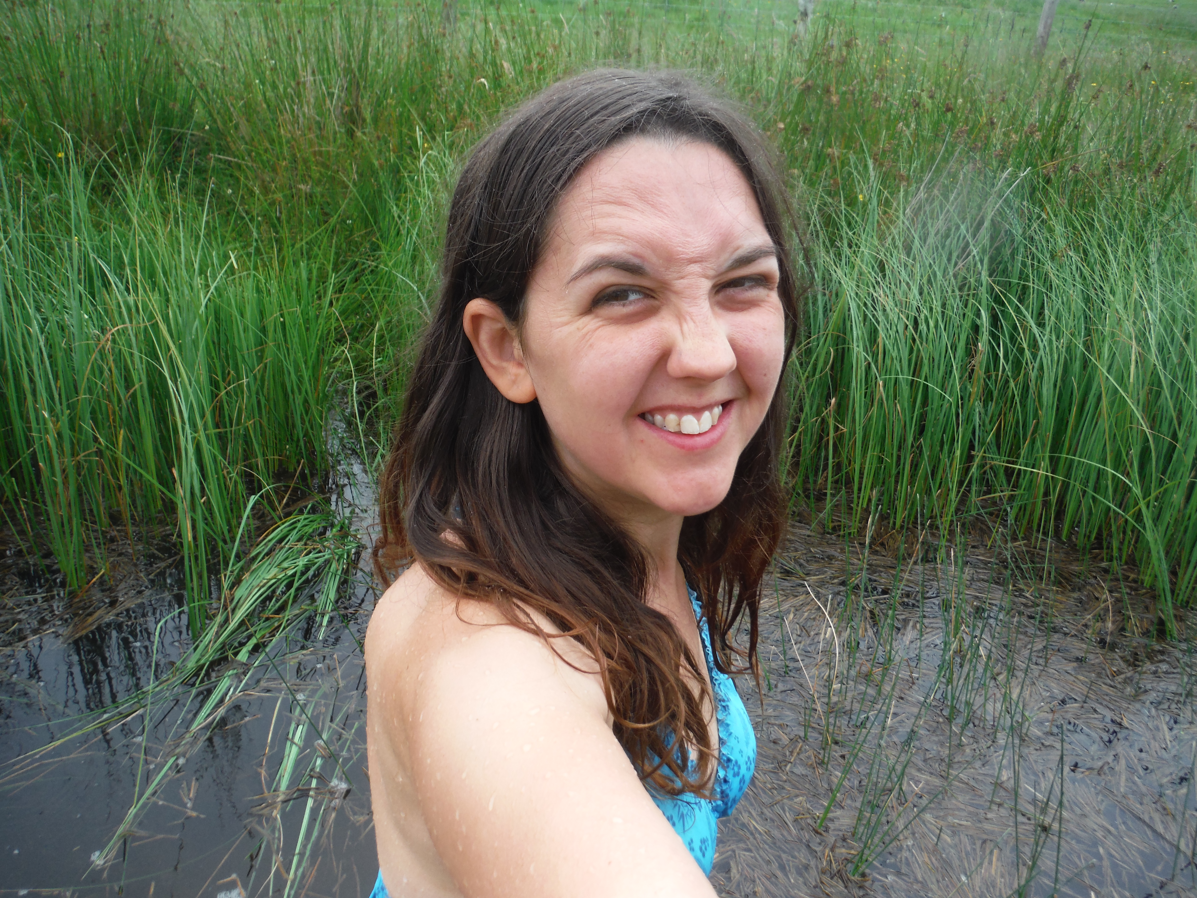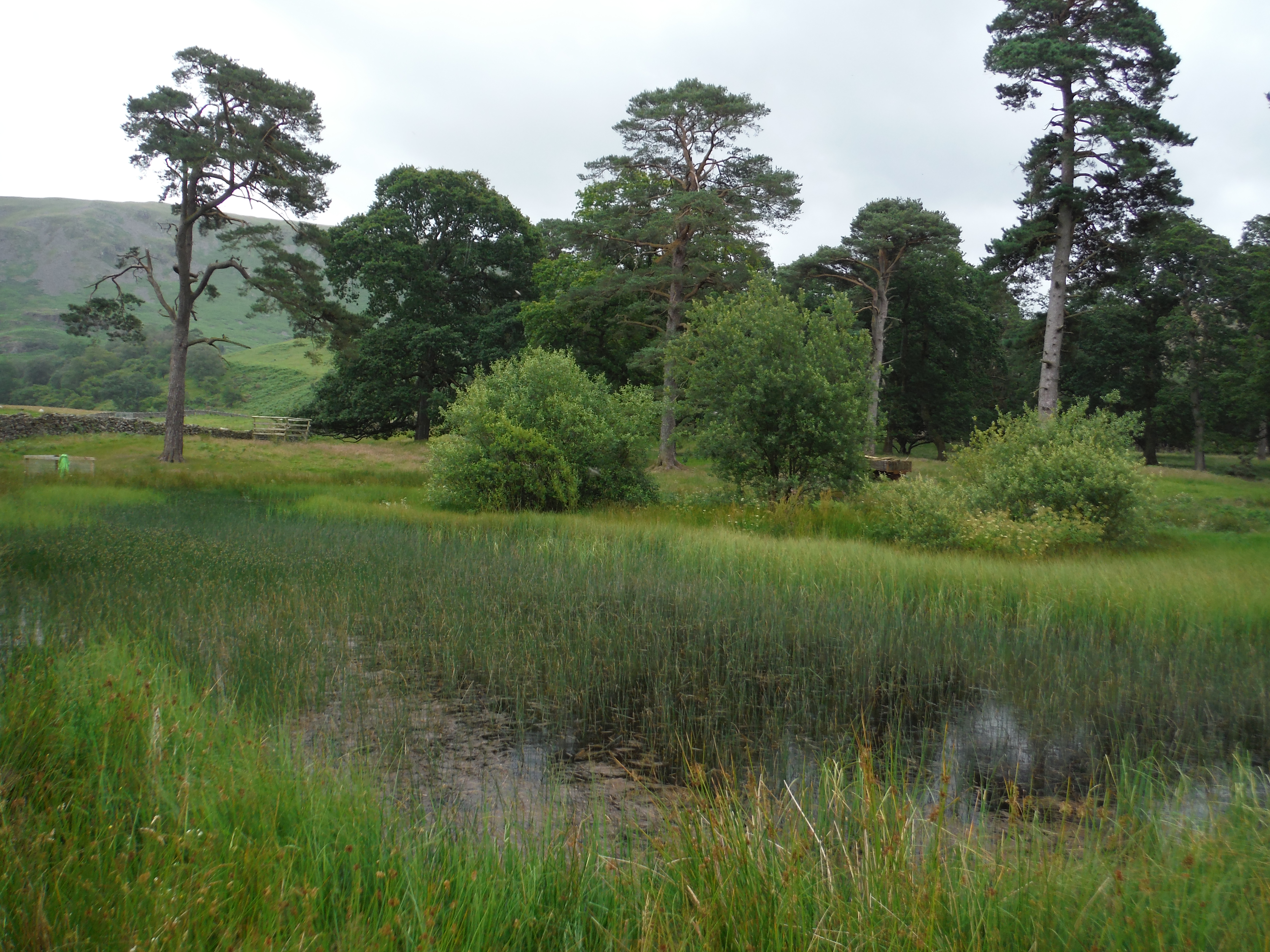I woke today to heavy grey skies, more wind than I would’ve liked and feeling tired and drained. I think the end of season at work has finally caught up with me. Bearing this in mind, and with the fact that I’m doing Coniston tomorrow in the back of thoughts, I decided to take it easy today. I spent the first part of the morning catching up on filling in my notebook and then got in the car and pootled over to Nether Wasdale. I was due to meet Torben at 12.00 and it was gone 11 by the time I got there, but I was determined to do one before I went to meet him. There is a tiny blue dot on the map, just outside the village labelled ‘Flass Tarn’, so that was where I headed. It was only a couple of minutes walk across a field and there it was. Or so the map lead me to believe at any rate. If I hadn’t been looking for it I think I may well have just walked past it without noticing. Almost the whole tarn was covered with reeds and plants. There was one small space at one end free of vegetation. But you know me by now. I was not to be put off. It had been raining when I’d parked and, unwilling to get all my clothes wet I had decided to strip down to my bikini (the bottom part of which is shorts by the way) in the car and walk to the tarn covered only by my lime green waterproof coat. So all I had to do was slip off my trainers, peel off the already sodden coat and gambol round to the far side. I had a nagging fear, this tarn being so close to the village, that at any moment a farmer would appear and see me, clad only in my bikini, thrashing my way pointlessly through thick weeds in a muddy, foot-deep pond in the rain and ask me what the hell I thought I was doing. I wasn’t quite sure what my answer would be. I tried, as ever, to carefully and daintily walk my way into the water to test the temperature and depth. I failed spectacularly. Catching my foot on an unexpected rock I fell with a graceless splosh into approximately two feet of mud covered by one foot of water. Undaunted I decided it was a good thing I’d got in so easily and ploughed forwards through the thick growth of reeds, propelling myself forwards mostly by doing the crocodile crawl with a few useless swimming strokes thrown in for good measure. I finally made it across and was just about to heave myself out when it happened. That thing I’d been dreading. Voices. A moment later a couple walking their dog appeared in the field next to me. I stood up, covered in mud and dripping wet and grinned sheepishly at them. They took a moment to take in the scene before them and then in true British style said only ‘I bet that woke you up!’ and walked on.