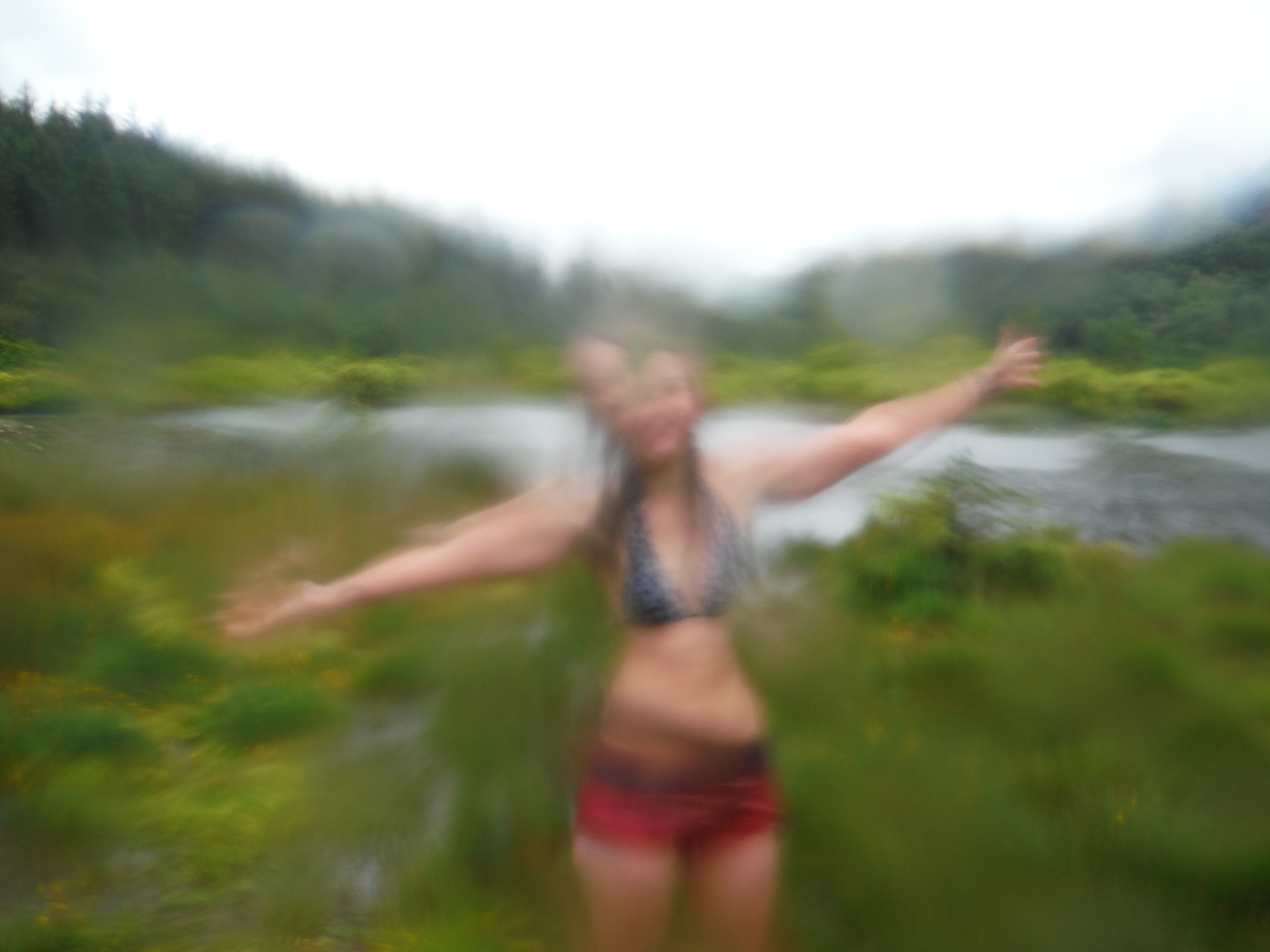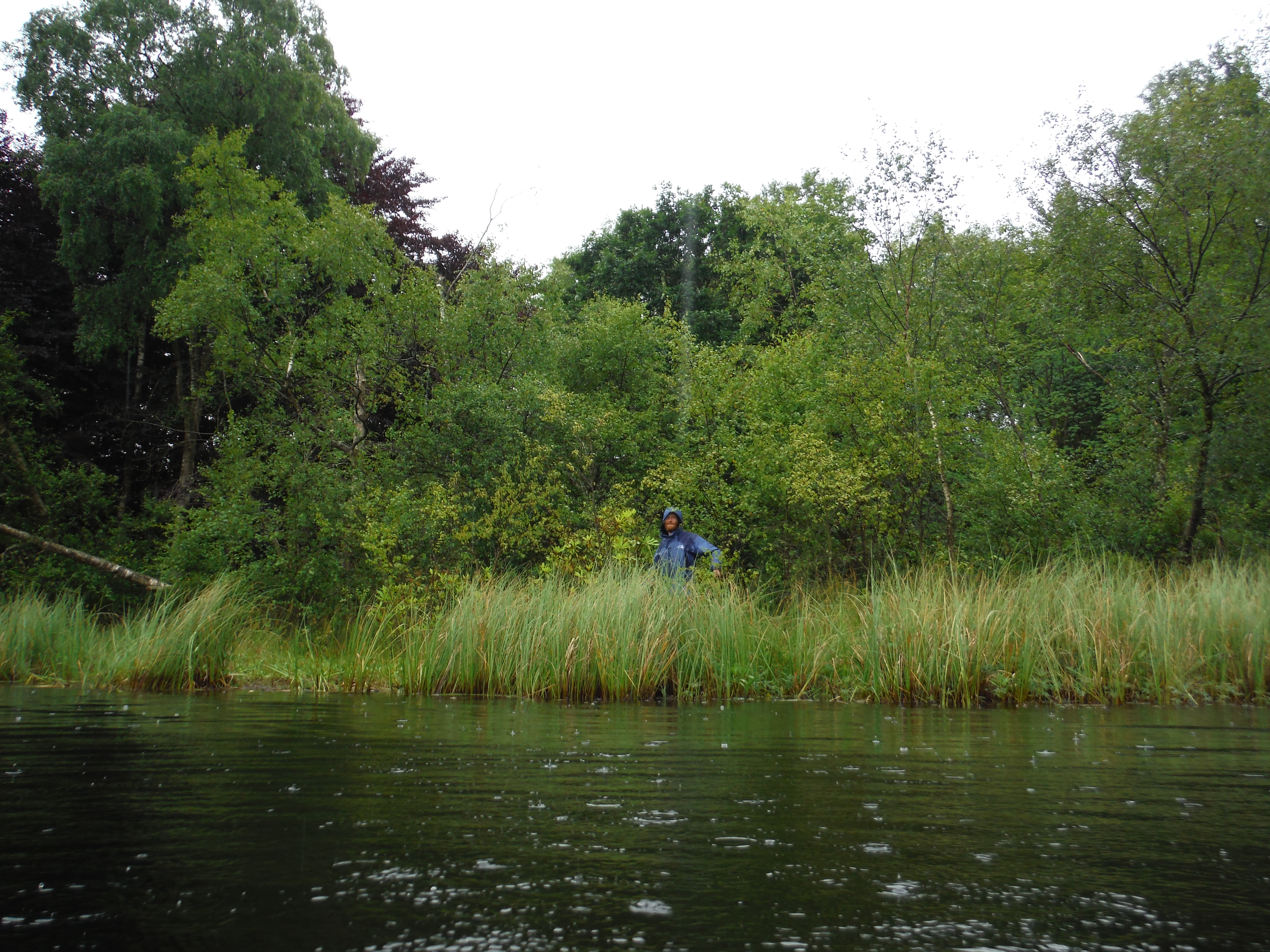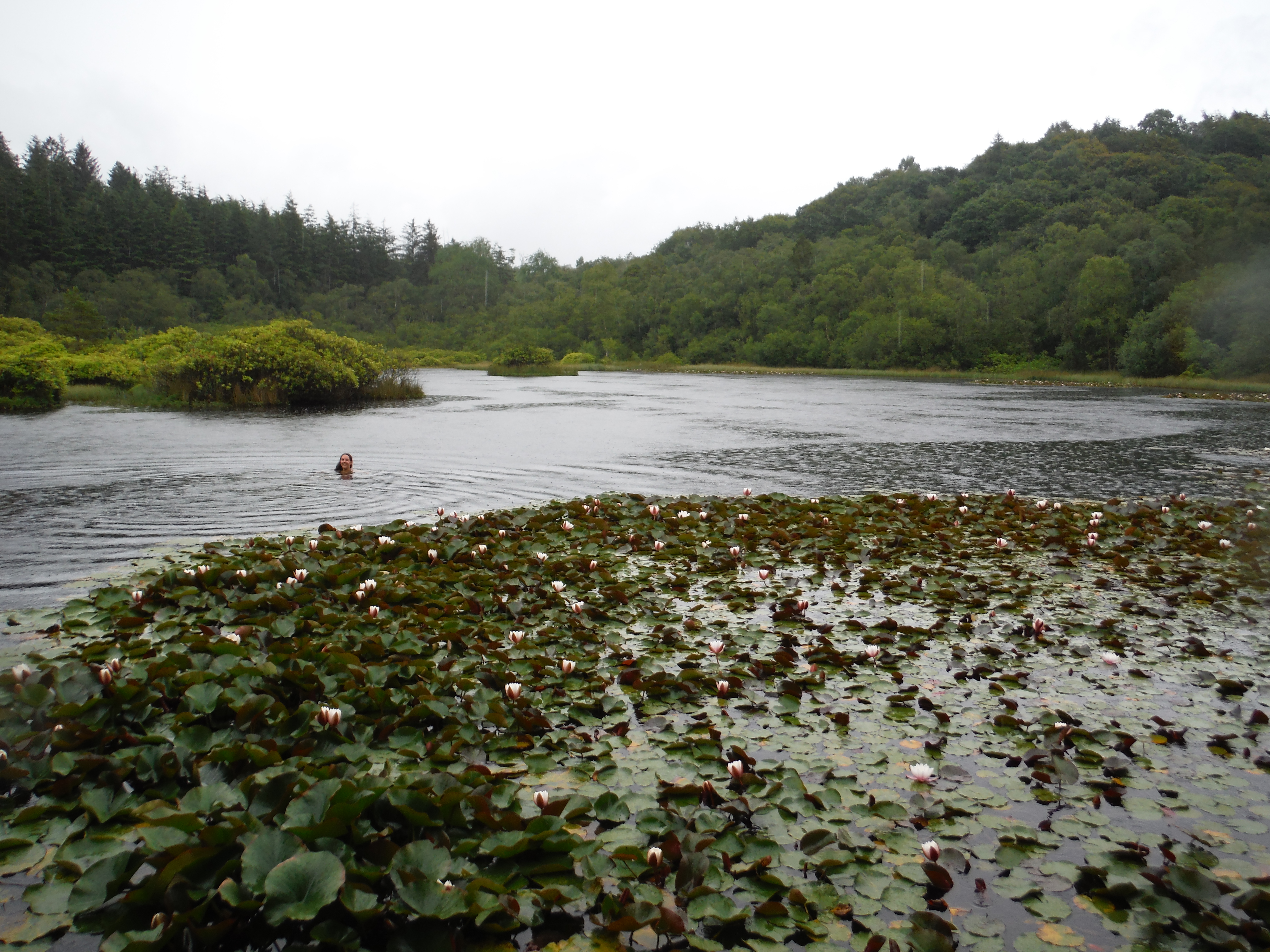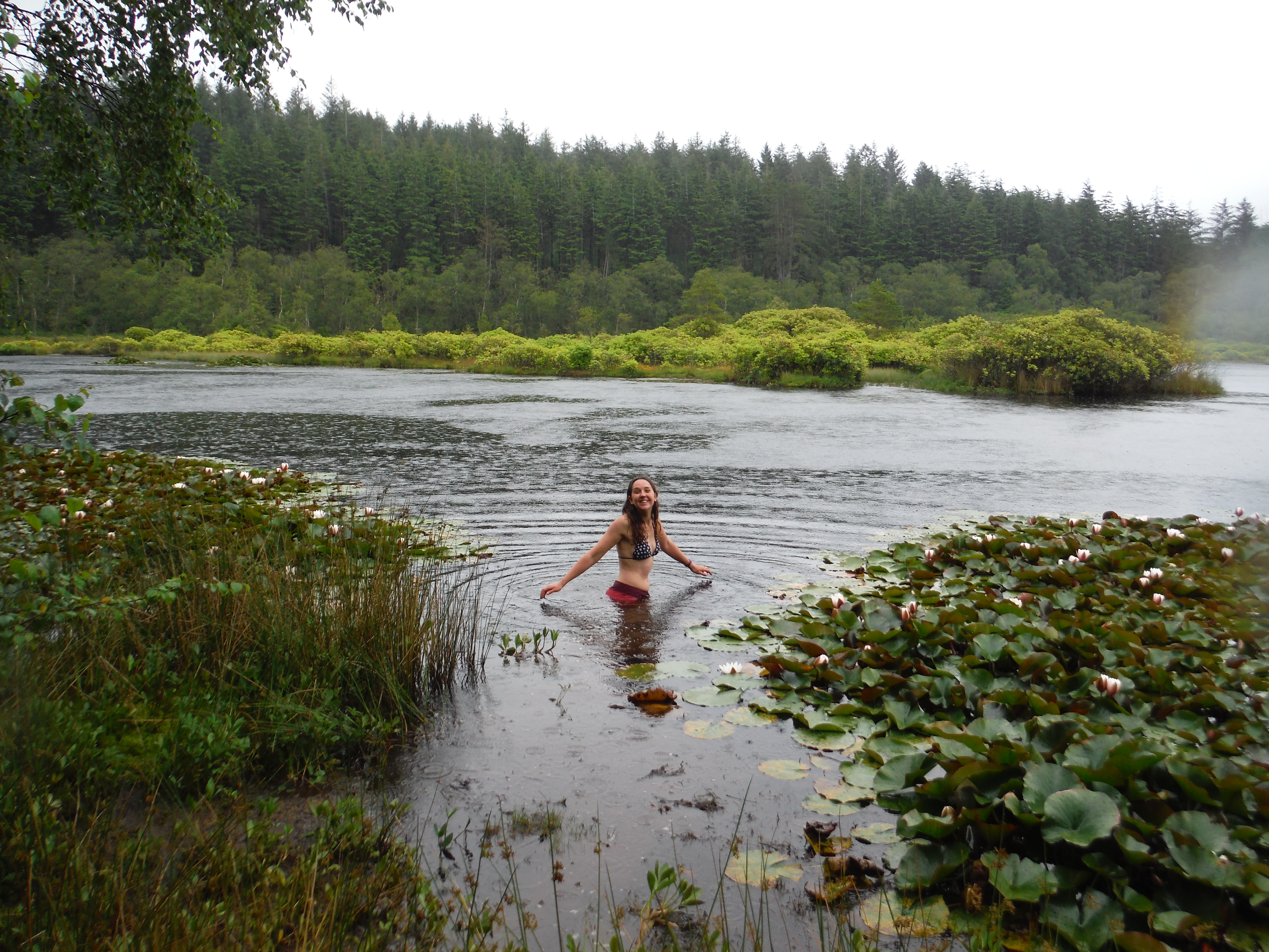 The water was very warm which was lovely. The smell that arose, bubbling up from the depths of rotting plant life from years past was not lovely. As the smell of rotten eggs surrounded me I grinned back at Torben who seemed very happy in his decision not to get into the water. To be honest, he was probably right. The tarn, although it was a reasonable size, was very shallow. Swimming was very hard work in such shallow water as there were lots of weeds and my knees kept scraping the bottom, but I kept going as I was keen not to stir up any more of the smell. I did a sort of circle, ending up a little way round the bank from where I’d started. Torben carried my coat and my shoes and came round to meet me. The ground was very marshy here and he called out ‘How deep do you think it iiiiiiii…….’ but the last word got a little lost as his leg vanished up to the thigh in the bog. Getting out was a challenge. It was very muddy at the edge and, as mentioned, it was very sinky. Very, very sinky, especially close to the edge of the water. So the only way to move across it was to crawl, spreading my weight between my shins and my hands. And so, soaking wet and streaked in mud I crawled through the rain across the bog to where Torben stood holding my things and laughing at me. I managed to stand up and promptly fell down the very hole that he had made only a couple of minutes before.