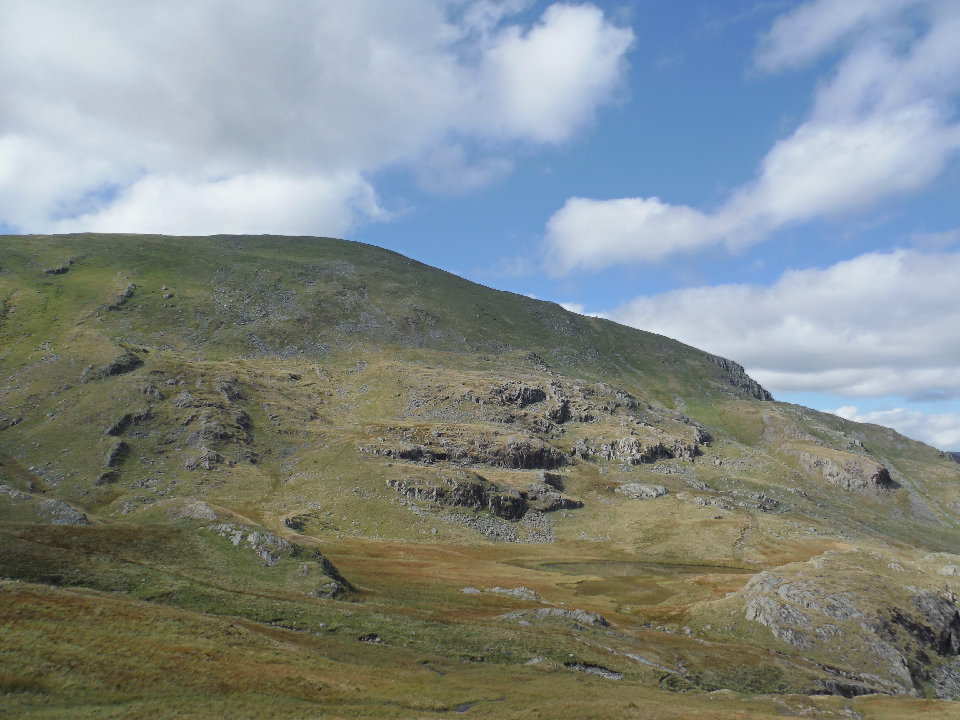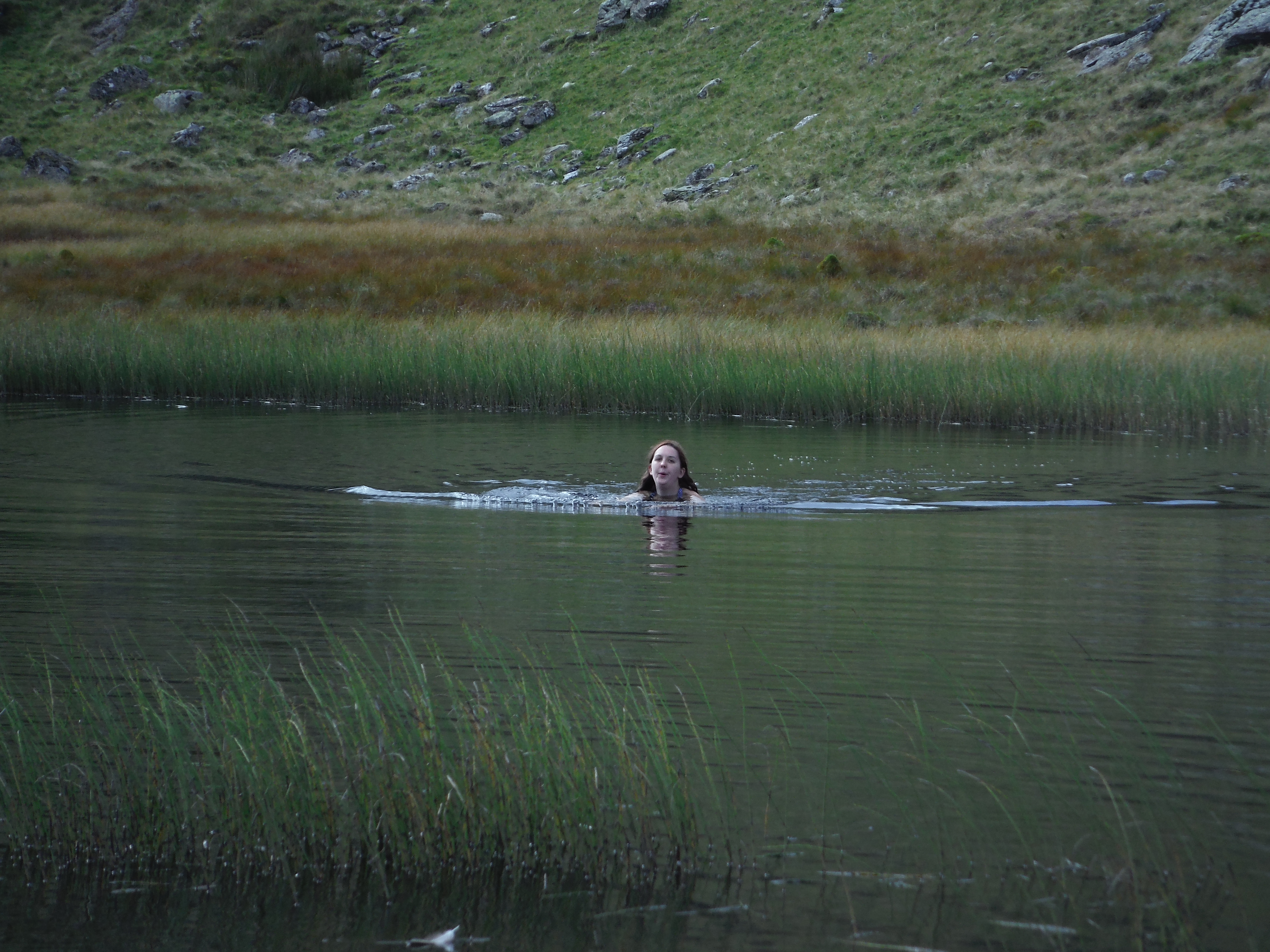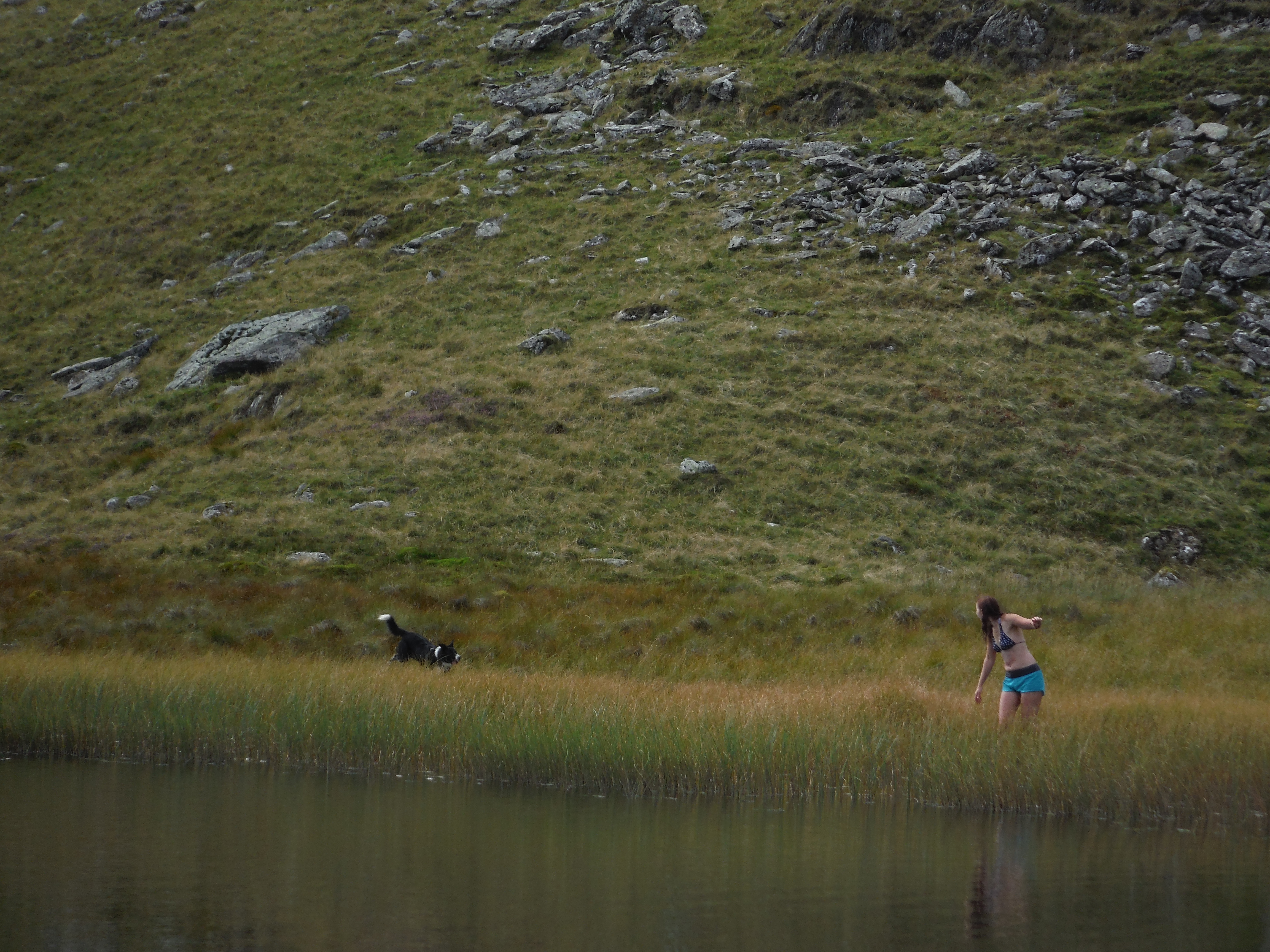 I dried myself off, wrapped my towel around my shoulders and we set off on the short tramp over to Dale Head Tarn. This was much more satisfying. A bit bigger than Launchy Tarn and a lot deeper! Rhys waited on the bank while I set off round the tarn, Ben at my heels, unsuspecting that I was yet again about to do something utterly unfathomable. I got into the water among some reeds and through the inevitable thick sediment. I had to do a sort of knees-walk for the last bit to spread my weight around, as each step when I tried to walk normally was dropping me hip-deep into the sludge. But once I got away from the reeds the bed dropped away sharply and I was suddenly out of my depth and swimming. The water was icy cold, but it felt so good to be properly swimming! It only took a couple of minutes to get across which was a shame in a way – I think I was just getting used to the cold when I got out. The water stayed very deep (out of my depth) until I was only a few feet from the shore, which was a bit disconcerting – I kept thinking ‘I must be able to put my feet down by now’ but every time I tried they just met more water. The edge was very rocky which made it a bit difficult to get but Rhys was there, handing me the towel before I was even out of the water, which was very nice! The sun had gone in just as we reached the tarn and now that I was out and dry again it came back out. Typical! It was a really nice swim though, despite the cold and it felt so good to be doing it again. Not sure how many more I’ll manage to get in this year before winter descends on us, so it felt really good to make the most of a sunny day!
