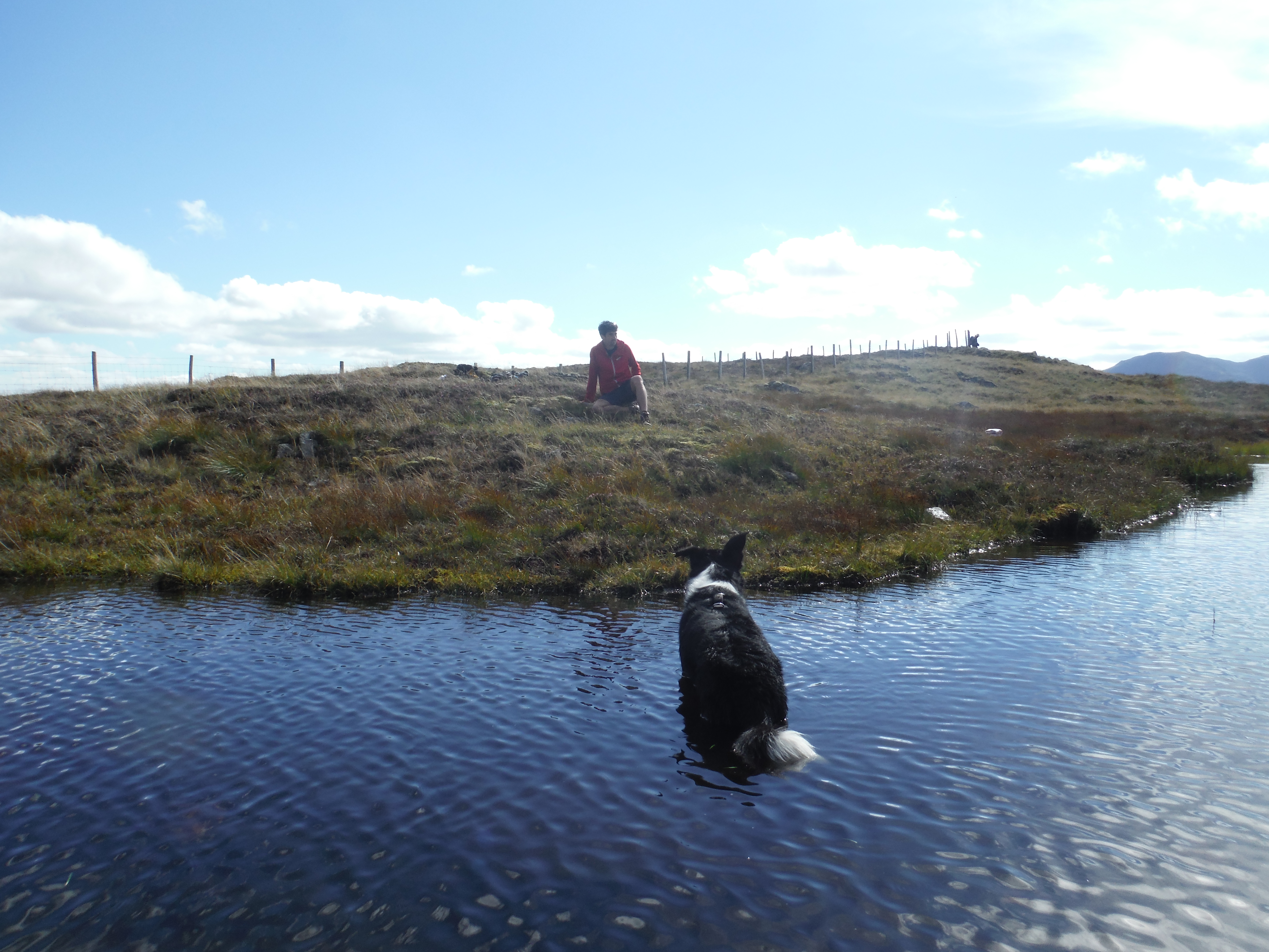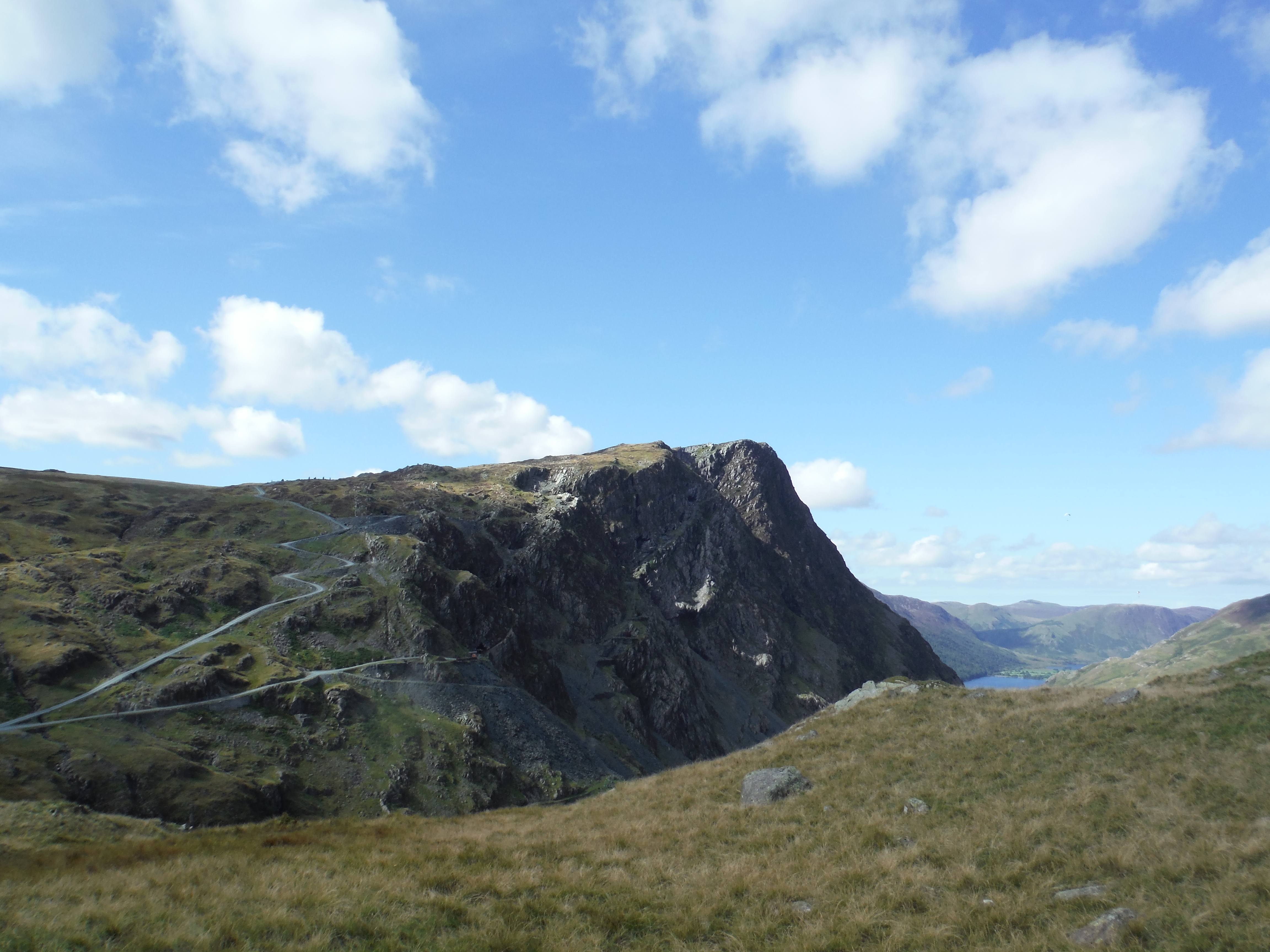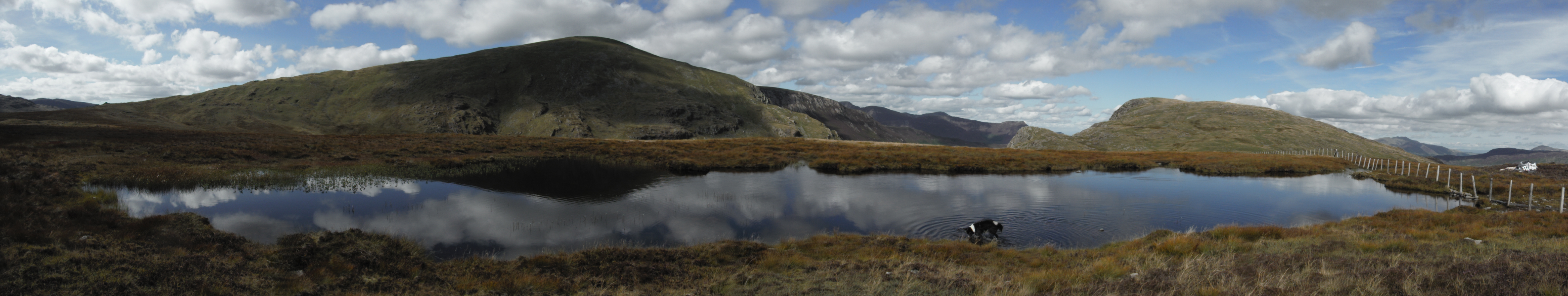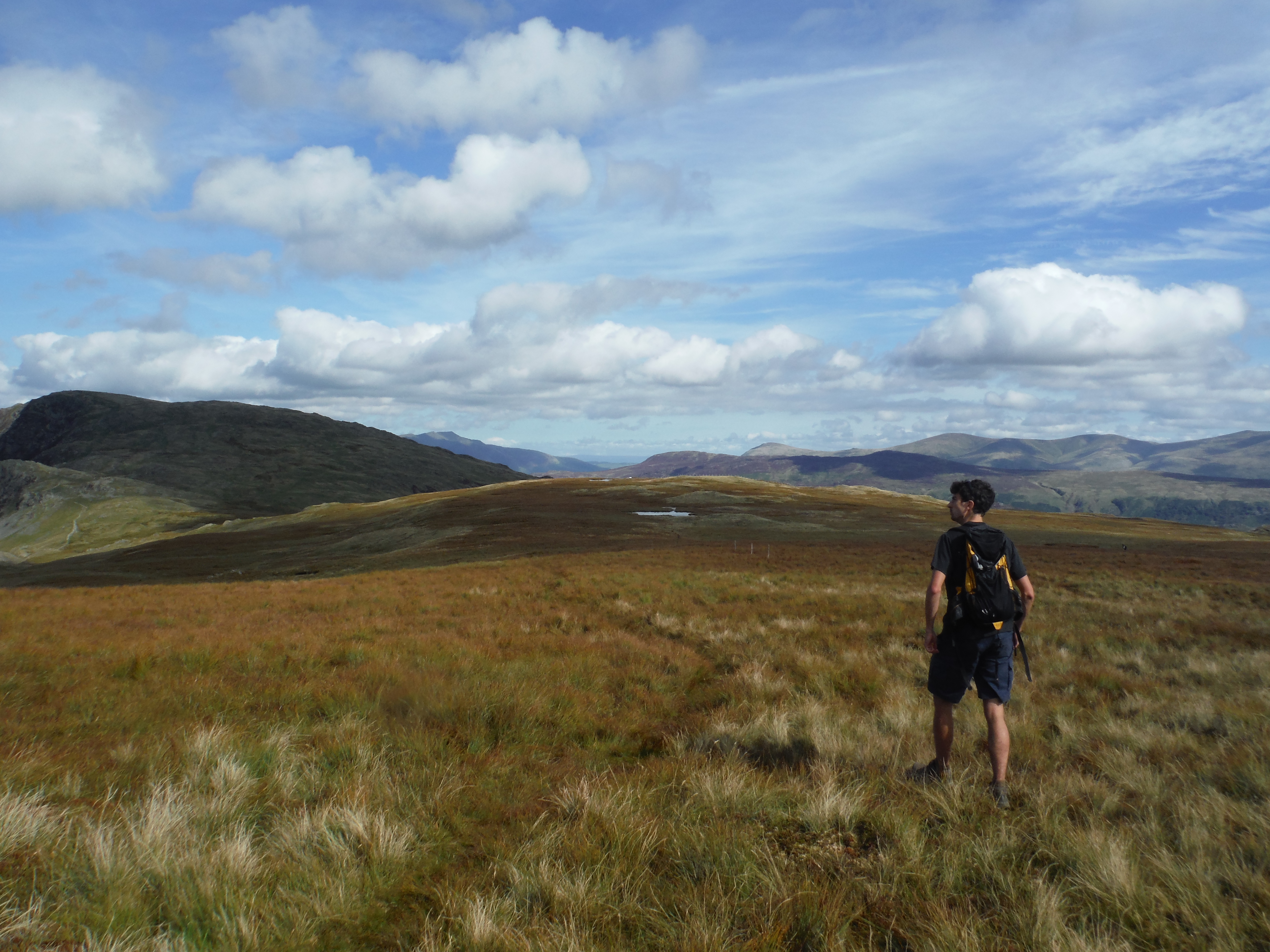 I dried myself off, wrapped my towel around my shoulders and we set off on the short tramp over to Dale Head Tarn. This was much more satisfying. A bit bigger than Launchy Tarn and a lot deeper! Rhys waited on the bank while I set off round the tarn, Ben at my heels, unsuspecting that I was yet again about to do something utterly unfathomable. I got into the water among some reeds and through the inevitable thick sediment. I had to do a sort of knees-walk for the last bit to spread my weight around, as each step when I tried to walk normally was dropping me hip-deep into the sludge. But once I got away from the reeds the bed dropped away sharply and I was suddenly out of my depth and swimming. The water was icy cold, but it felt so good to be properly swimming! It only took a couple of minutes to get across which was a shame in a way – I think I was just getting used to the cold when I got out. The water stayed very deep (out of my depth) until I was only a few feet from the shore, which was a bit disconcerting – I kept thinking ‘I must be able to put my feet down by now’ but every time I tried they just met more water. The edge was very rocky which made it a bit difficult to get but Rhys was there, handing me the towel before I was even out of the water, which was very nice! The sun had gone in just as we reached the tarn and now that I was out and dry again it came back out. Typical! It was a really nice swim though, despite the cold and it felt so good to be doing it again. Not sure how many more I’ll manage to get in this year before winter descends on us, so it felt really good to make the most of a sunny day!