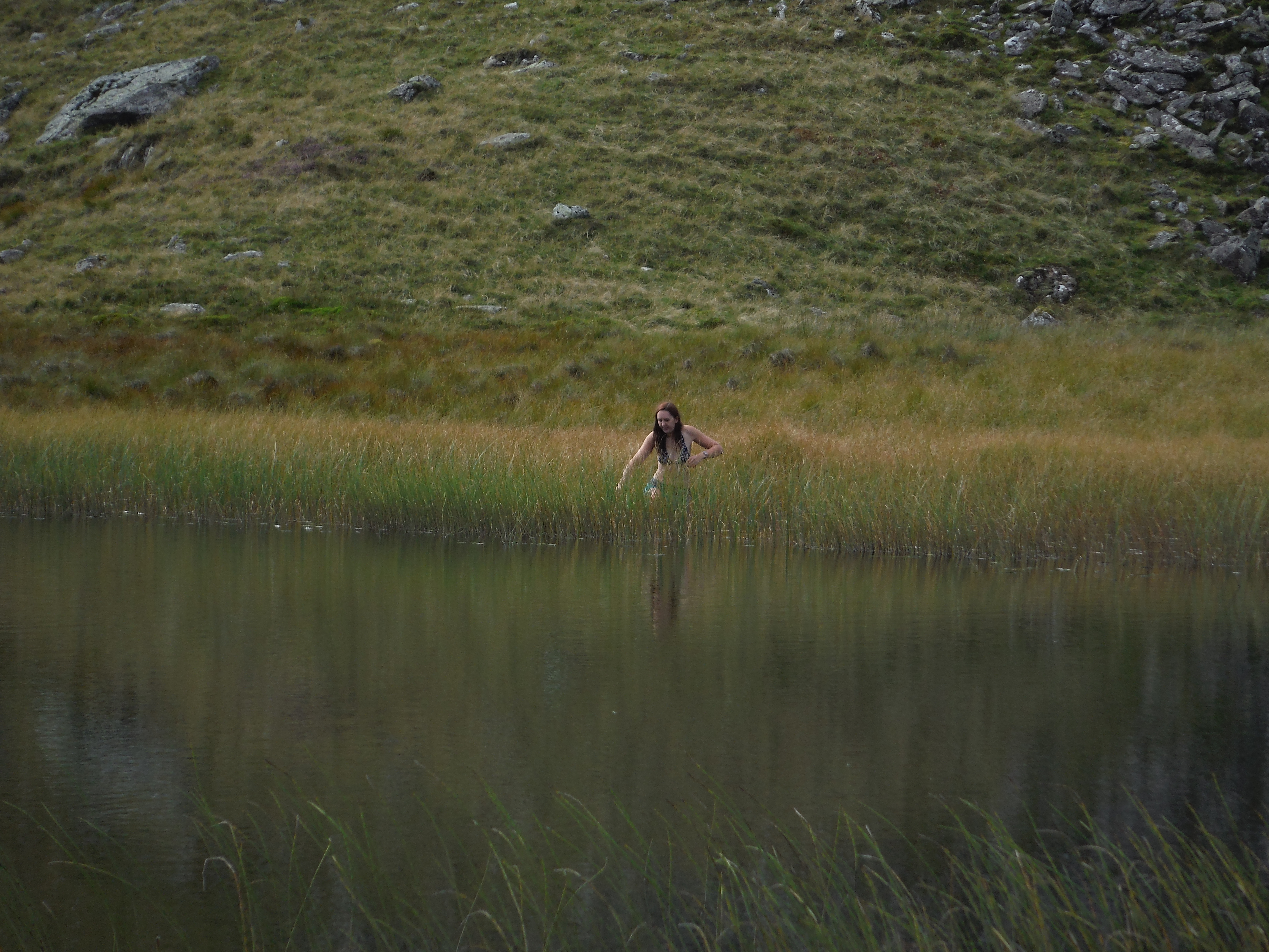 I met Rhys and Ben in Keswick and we headed up to Honister and parked at the back of the hostel. The path up to Dale Head is pretty steep but the views are fantastic, especially on a day like today when it was so clear. The heather is all in bloom and some of the mountains are covered in a beautiful, deep purple blanket, contrasting wonderfully with the greens and browns of late summer in the glorious sunshine. We cut off the path a little way up and traversed the side of the fell to get to Launchy Tarn. Ben got there well ahead of us and tested the water for me. He loves standing knee-deep in the water, but won’t go in any further. As we got close to the tarn I managed to walk straight into a bog, soaking my shoes. Oops. I took them off for the last little bit of the walk and was glad I did as a moment later I managed to step in right up to my knee. I really should look where I’m going! When we got right up to the tarn it became painfully obvious that swimming was not really going to be an option. Although it’s not as small as some of the other tarns, it’s very, very shallow… Ridiculously shallow. And rocky. I’ve ‘swum’ in tarns where the water is really shallow, but they’ve always had a thick layer of sediment on the bottom for me to drag myself through. As I made my way around the tarn I could see the bottom in every bit of it, the rocks on the bed only inches from the surface even in the middle. Ben came round with me, clearly approving of splashing around in the shallows, but when I started to make my way to the middle of the tarn he started to get worried about me and darted around at the edge whining and generally looking very concerned about my sanity. I have to admit, he had a point. I was walking through freezing cold water, picking my way with bare feet over slippery, painful rocks. The whole way across, the water never even got close to coming up to my knees. Eventually I tried to lower myself into the water and pull myself along (swimming really was out of the question!) but this just resulted in so many knocks and bangs to my poor knees, already over-sensitive due to the cold, that I gave up and just walked (well… it was more a sort of graceless scramble) most of the rest of the way. Near the end I did manage to just about get my head under the water for the traditional selfie, but only just! As I scrambled back to the bank Ben was still worrying about me, but Rhys reassured him: ‘It’s alright Ben, she’s just crazy’.