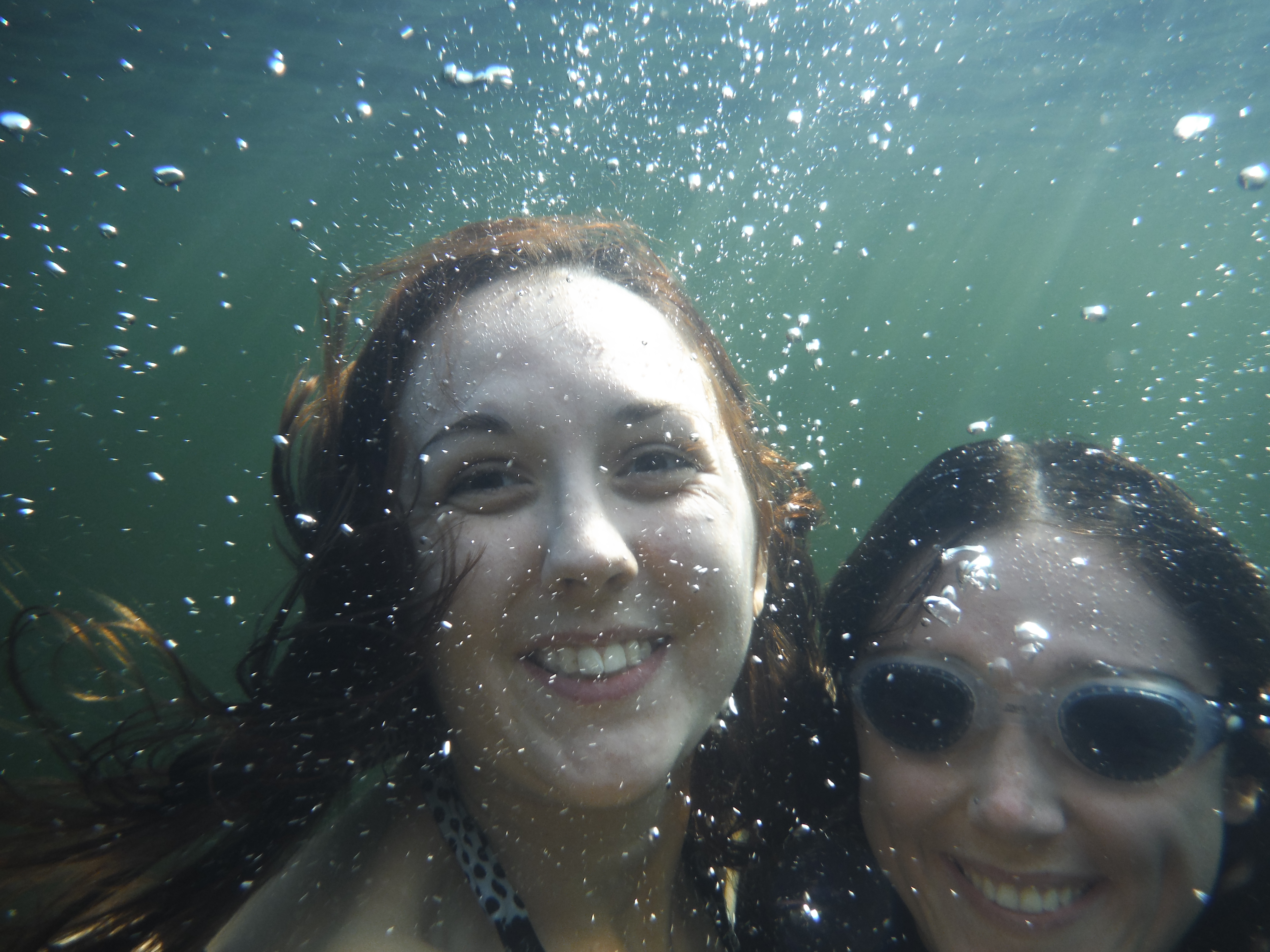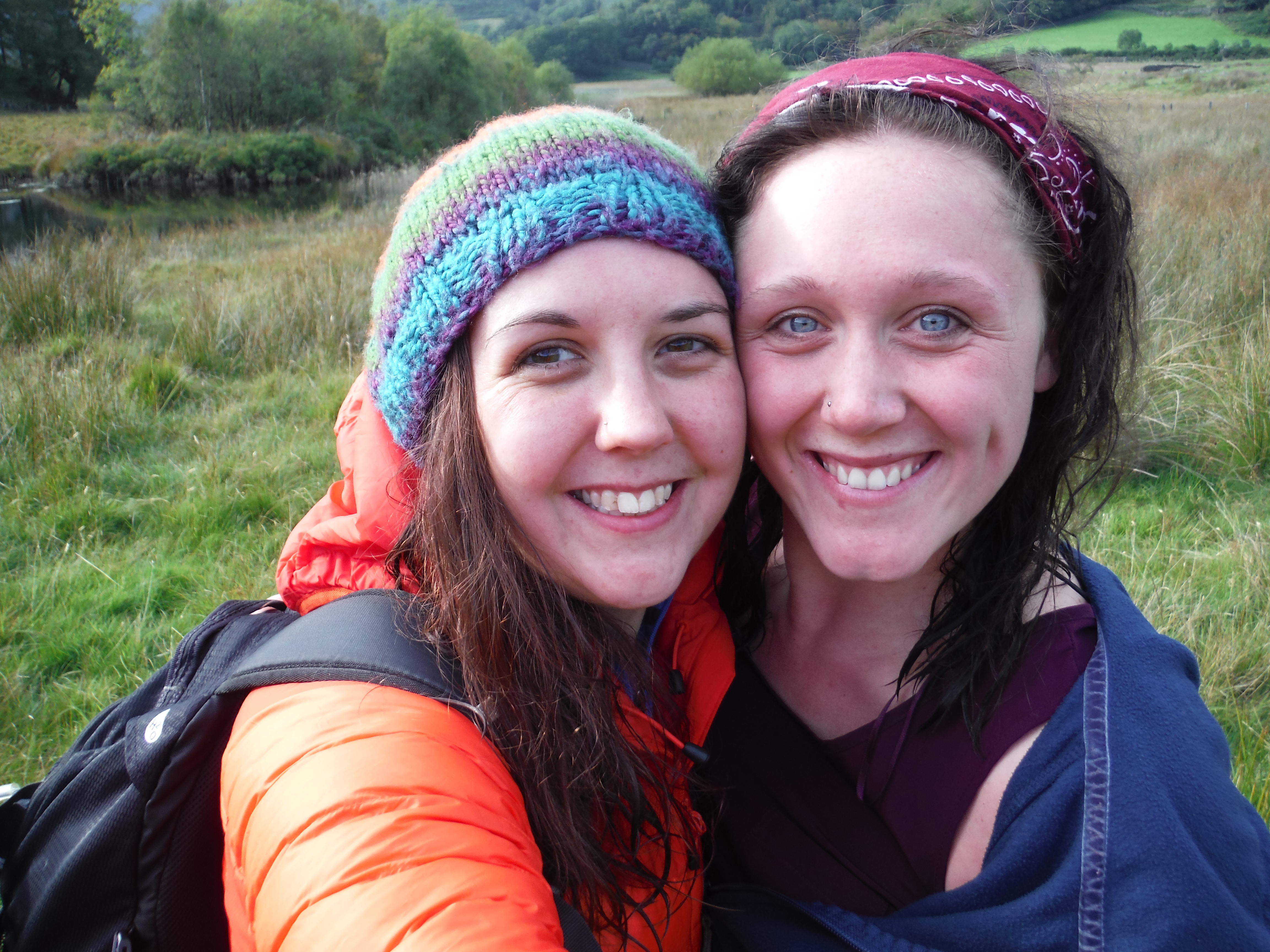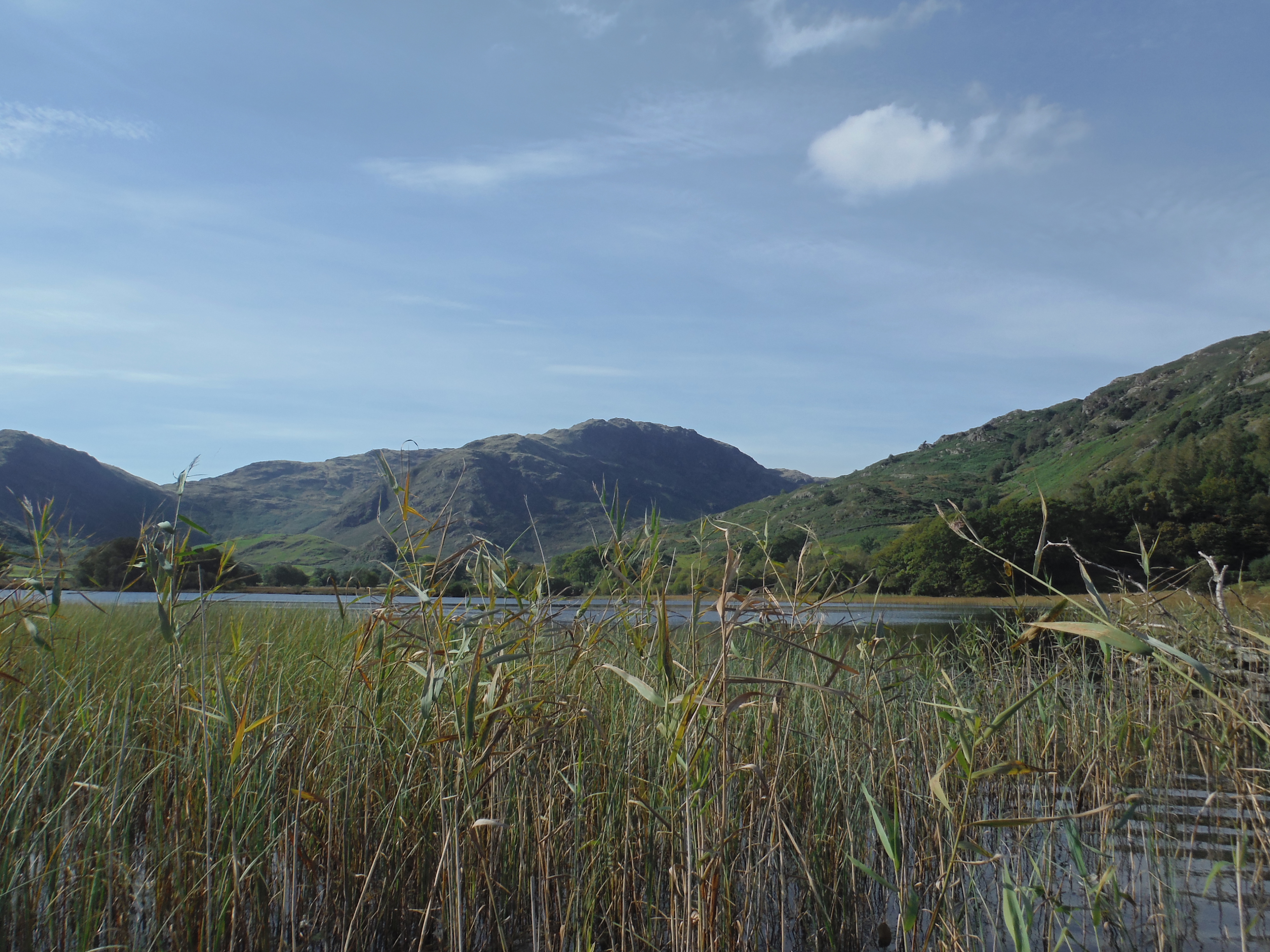 It’s only a short walk to the tarn but as we got close we realised that there’s a fence across the field blocking our way. The only way to get to the tarn was along the beck that runs away from it. So we left out things a little way from the bank behind a hillock, Hannah put on her wetsuit and I stripped to my bikini and we gingerly stepped into the water. The beck runs into a small pool where we got in, so it was pretty deep pretty quickly and I have to confess I was tempted to go back for my wetsuit. But having made the decision to go in without it I didn’t want to turn back now. Once we got out of the pool the beck was shallower, alternating between a firm, gravelly bed and a treacherous silty bed that our feet would suddenly sink into, causing us to unexpectedly find ourselves waist-deep in what had looked like a foot-deep section of water. Hannah was a little surprised by this unstable floor but by now I’m so used to walking through water where the floor falls away unexpectedly that I was just grateful that the smell was minimal! It took us about 15 minutes to get to the tarn even though it wasn’t far, but it was great when we got there. The reeds growing in the beck, although they weren’t very thick, managed to more or less hide the tarn until we were right in it. Although I lived in Great Langdale for a year, this was the first time I’d been right up to this tarn – and it’s very beautiful. The first few minutes were very shallow and we mixed wading and crocodile crawling. There’s a big area of weeds at this end of the tarn, and the water got deeper as we went through them. By the time we were past them I was swimming properly – and oh, it was cold! By this point my lower half was well used to the temperature, but my top half, especially my arms felt the biting pain of the cold, deep water. It was breath-taking, searing cold. But the fact that I’d made the decision to come in without my wetsuit made me plough on and I knew from experience that I would get used to it in time. And, of course, I did. By the time we got to the far side I was well acclimatised and it felt good to get into the shallower, warmer water. We stayed on the far side for a while, Hannah playing with my underwater camera and me enjoying the comparative warmth of the shallows. Even so, I started to feel cold and we set off back across the tarn. As we got to the near side I was really starting to feel the cold and was very aware that my core temperature was dropping. We stopped to get the traditional underwater selfie and then headed back into the beck. It only took us about 5 minutes to get back to the bags, although Hannah took a little longer than me as she found a heavily-laden blackberry bramble at the edge of the stream and stopped for a quick snack. But I really couldn’t stop – I could feel just how cold I had got and knew that I needed to get out of the water and get dry and warm as fast as possible. I had completely lost all dexterity in my fingers and Hannah had to take my wet-boots off for me! It felt so good to get dry and dressed – I had my down jacket with me and was very grateful for it and my woolly hat. The sun had gone in by now and although the day was still warm there wasn’t the blazing sunshine of earlier. We hurried back along the path, thinking of hot drinks in the pub near where we’d parked the car, but got distracted many times along the way by the hundreds of big, ripe blackberries at the side of the track. We gathered lots to be infused into gin at a later date and ate lots more.